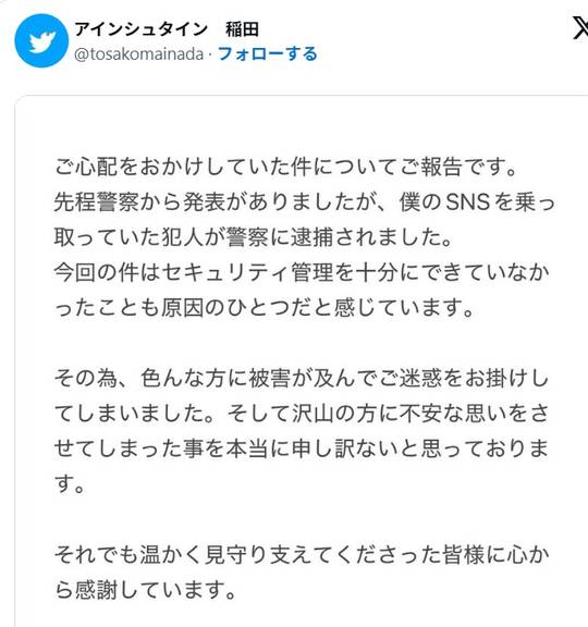 アインシュタイン稲田さんのインスタを乗っ取った男を逮捕