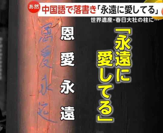 【奈良県】世界遺産・春日大社の柱に“中国語の落書き” 青い文字で“恩愛永遠”