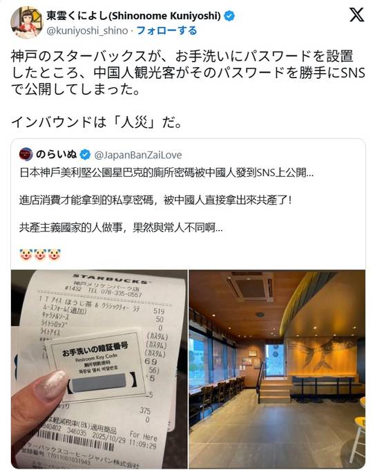 兵庫県神戸市内のスターバックス店舗で、店内利用者のみが使えるトイレのパスワードが中国人観光客によってSNS上に公開され、物議を醸している。