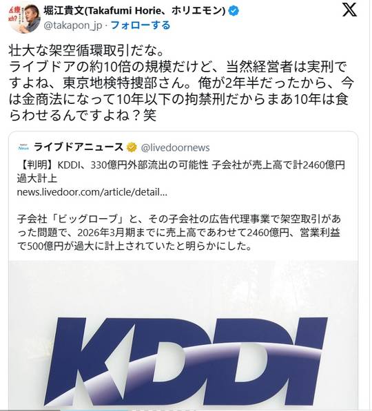 堀江貴文「壮大な架空循環取引だな。ライブドアの約10倍の規模だけど、当然KDDIの経営者は実刑ですよね?」