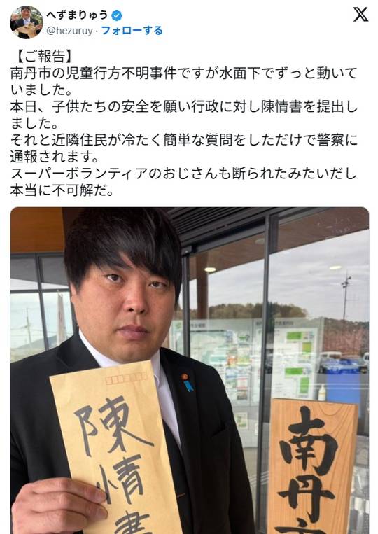 へずまりゅう議員「南丹市の児童行方不明事件ですが水面下でずっと動いていました。」