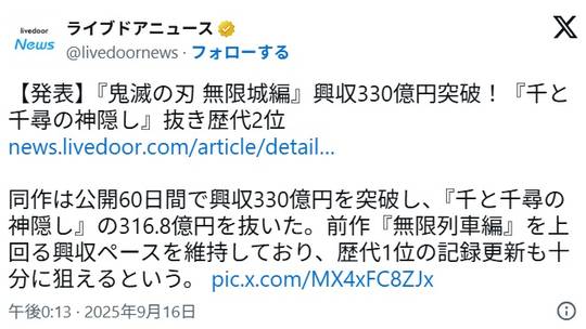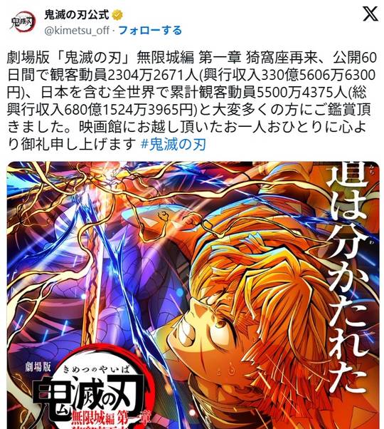 劇場版『鬼滅の刃 無限城編 第一章』が公開60日間で興行収入330億円突破!全世界で総興行収入680億超え