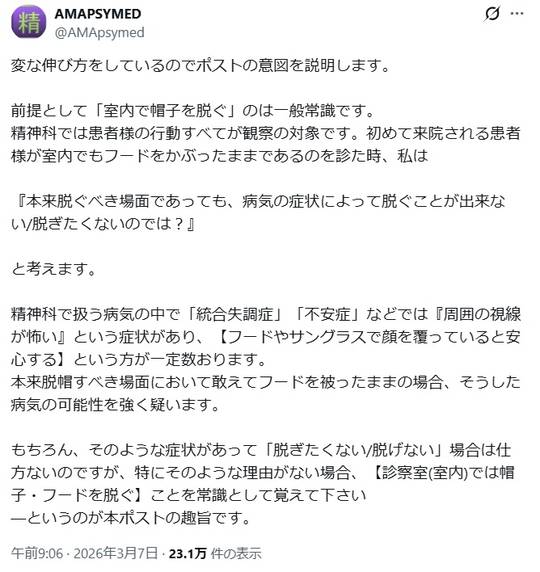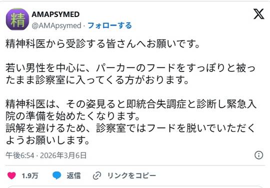 精神科医「パーカーのフードを被ったまま診察室に入ってくる方・・・その姿見ると即統合失調症と診断し緊急入院の準備を始めたくなります」